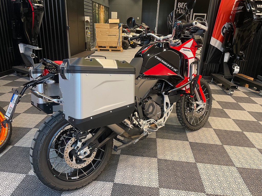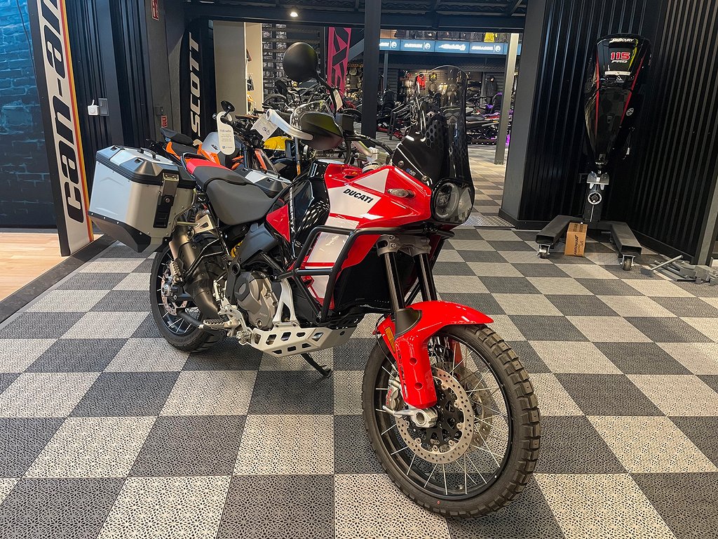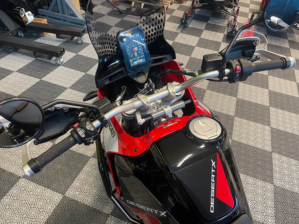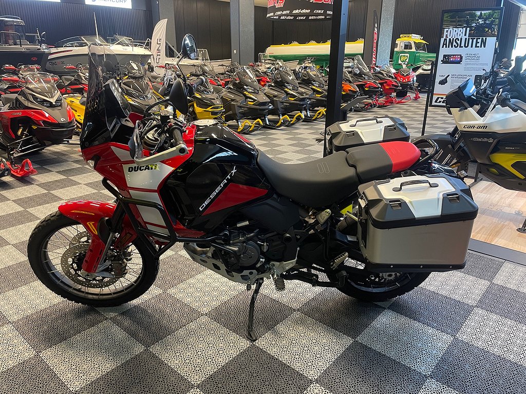 Begagnad: Ducati Desert X 950 Discovery -25 i mkt fint skick. 1 ägare sedan ny och endast 353 mil. Fabriksutrustad med sidoväskor i aluminium, Blåtandsmodul med Turn by Turn navigation, kraftigare hasplåt v-handtag h-skydd kylarskydd samt centralstöd. Ridemodes Sport Touring Urban Wet Rally Enduro justerbara 4 powermodes Cornering ABS (3 nivåer och avstängsbart) Traction control ( 8 Nivåer )