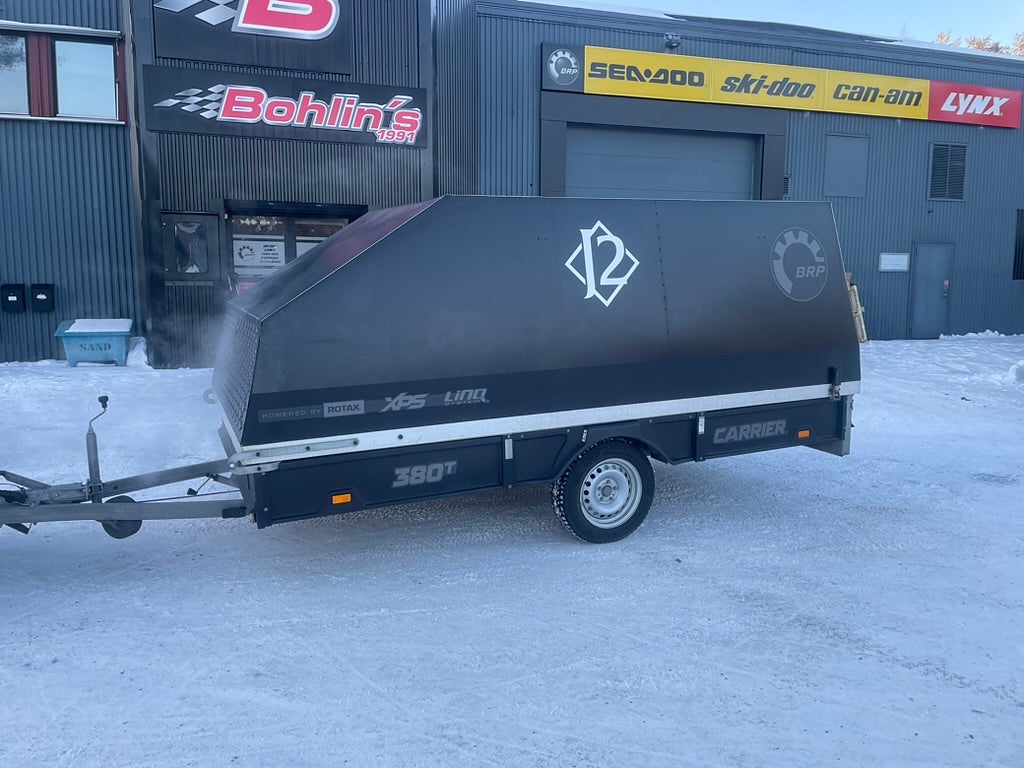 Begagnad: BRP Carrier 380 TXI momsad. Perfekt vagn för 2 st skotrar. Utrustad med svarta sidor Invändig belysning 1260 kg totalvikt Sommar och Vinterdäck. Besiktigad t.o.m 2027-09-30